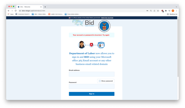 These phishing emails invited recipients to submit bids for “ongoing government projects" and claimed to be from a senior DoL employee responsible for procurement.